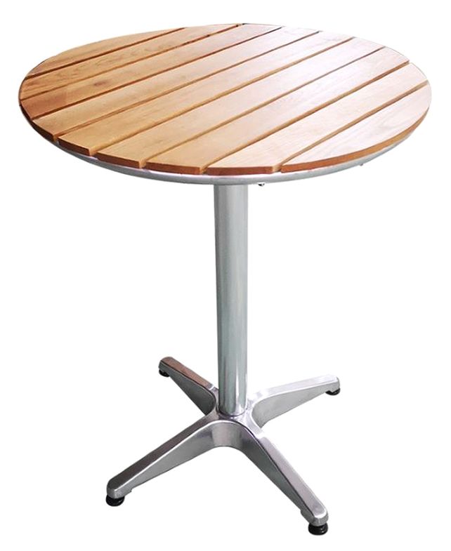 Стол алюминиевый круглый с деревянной столешницей для кафе, фудкорта, террасы, веранды, бургерной, бара, бистро, ресторана, отеля, гостиницы, пляжа, пекарни, патио, балкона, дачи. Основание и труба из алюминия. Столешница из деревянных реек из массива лиственницы. Размеры: D60 см, высота стола 70 см, вес 10 кг. Алюминиевые столы подходят для использования в помещении и для уличного кафе. Производства Китай.